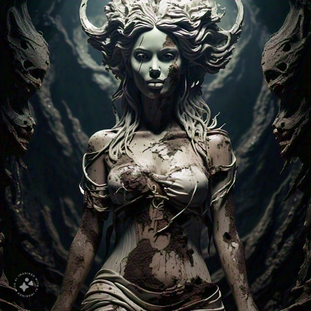 The Mother Earth (*Dʰéǵʰōm Méh₂tēr) is generally portrayed as the vast (*pl̥th₂éwih₂) and dark (*dʰengwo-) abode of mortals, the one who bears all things and creatures. She is often paired with Dyēus, the daylight sky and seat of the never-dying and heavenly gods, in a relationship of contrast and union, since the fructifying rains of Dyēus might bring nourishment and prosperity to local communities through formulaic invocations. Dʰéǵʰōm is thus commonly associated in Indo-European traditions with fertility, growth, and death, and is conceived as the origin and final dwelling of human beings.