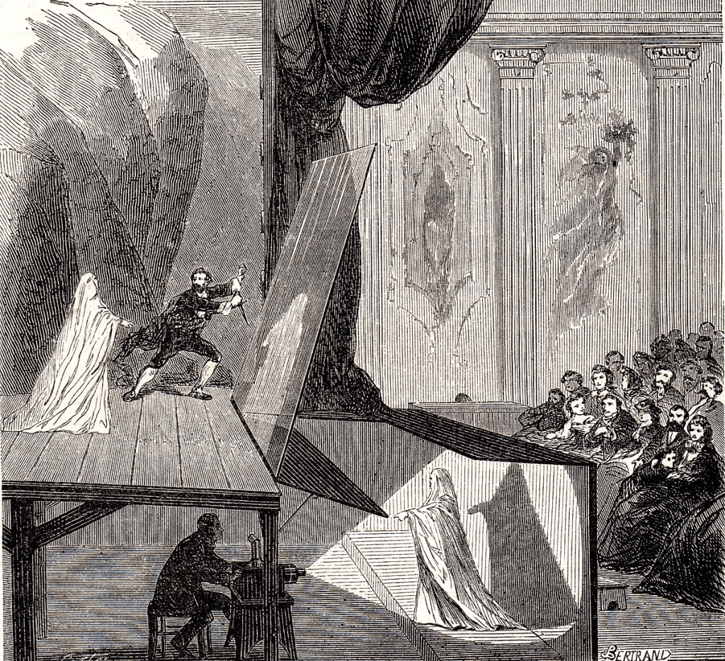 Pepper’s ghost is an illusion technique, used in the theatre, cinema, amusement parks, museums, television, and concerts, in which an image of an object off-stage is projected so that it appears to be in front of the audience.